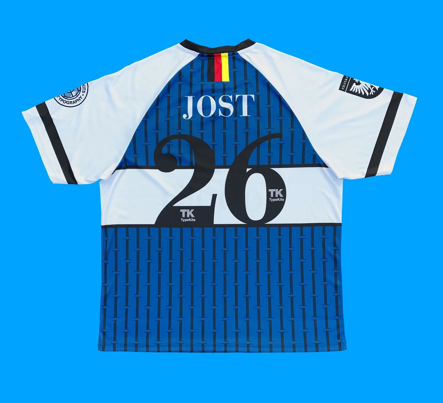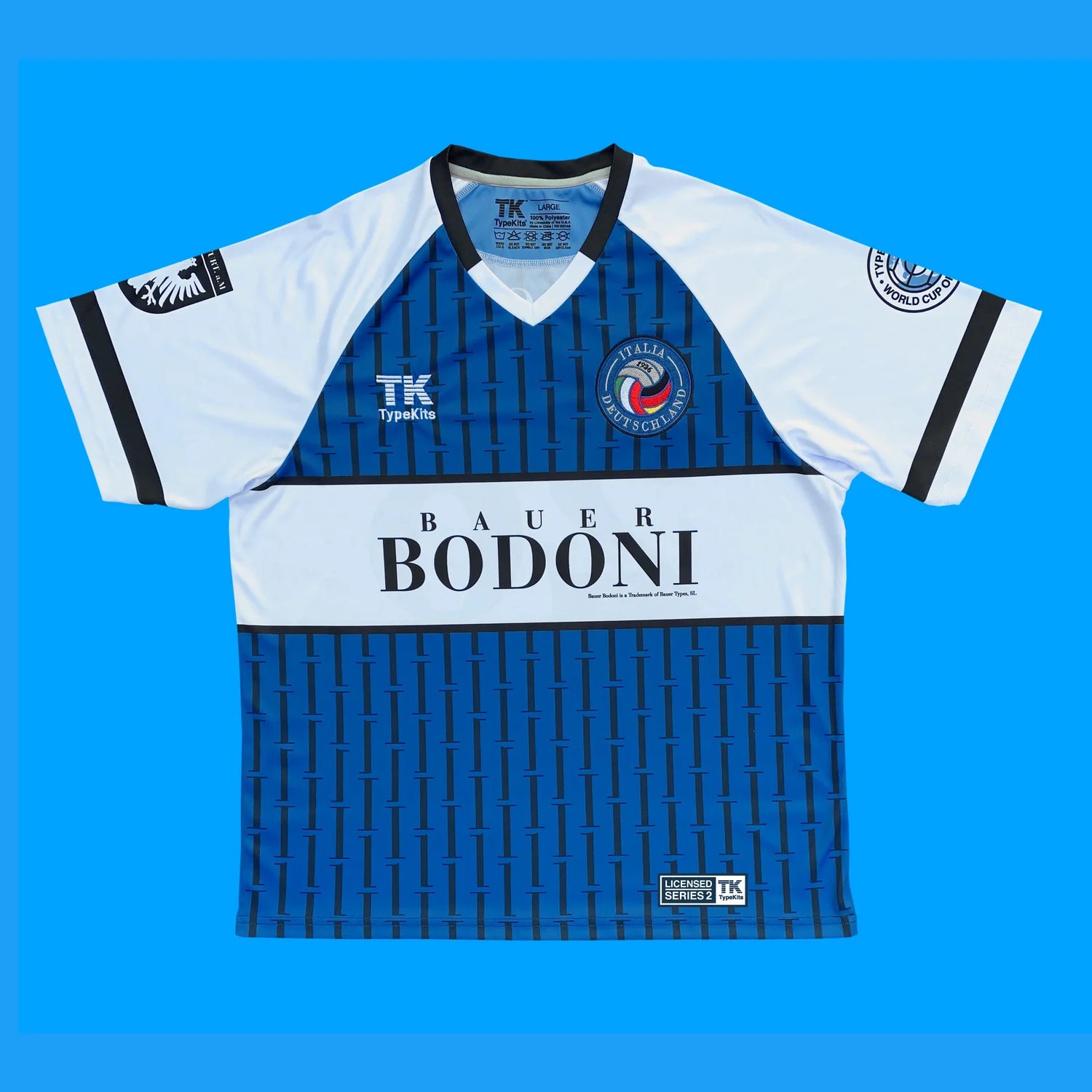 Although this version of the typeface is German in derivation, the original basis is Italian, so this design needed to represent both nations, but a heavier slant towards Italy was chosen. The blue is that of the Italian national team. The crest is a vintage 22 panel ball as would be used in 1926 but the positioning of the ball, with the two front sets of 3 panels, nicely allowed the two country flags to be worked in. Since the design is of Italian influence, the German flag is added on the nape vertically, along with the City of Frankfurt crest - home of Bauer Type Foundry - on the sleeve. The pin stripe design was constructed using the ascenders and descenders of the letterforms in a rhythmic offset pattern. And the central bar holding the name was actually influenced by Italian cologne brands like Armani - typeface: Didot - part of the of Didone classification - of which Bauer Bodoni is also classed.
