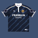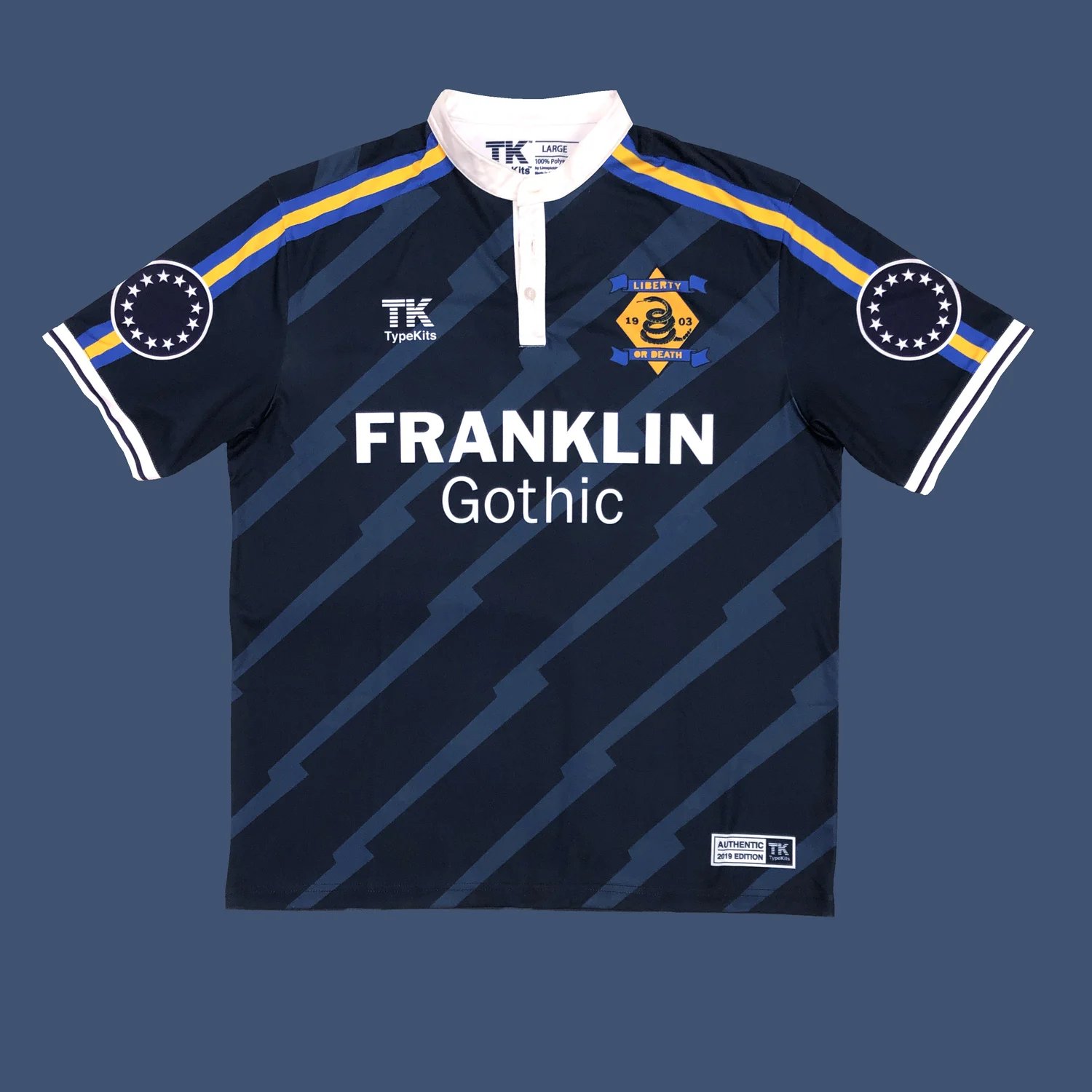 Using the reference towards Benjamin Franklin, the shirt has a more antiquated collar detail. The cross shirt pattern of lightning bolts is areference to his discovery of electricity when he flew a kite (as used in the crest design) with a key (as seen on the back of the shirt) tied to the end of the tail in a lightning storm. On the sleeve are the Betsy Ross US Flag Star formation representing the 13 colonies - ties together with shoulder stripes that are in the colors of Philadelphia’s civic flag. The coiled snake on the crest is a reference to the Don’t Tread on Me, Gadsden Flag who designed it as a riff on Benjamin Franklin’s woodcut “Join or Die”.